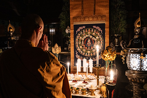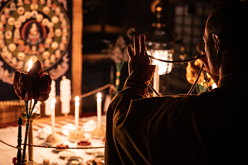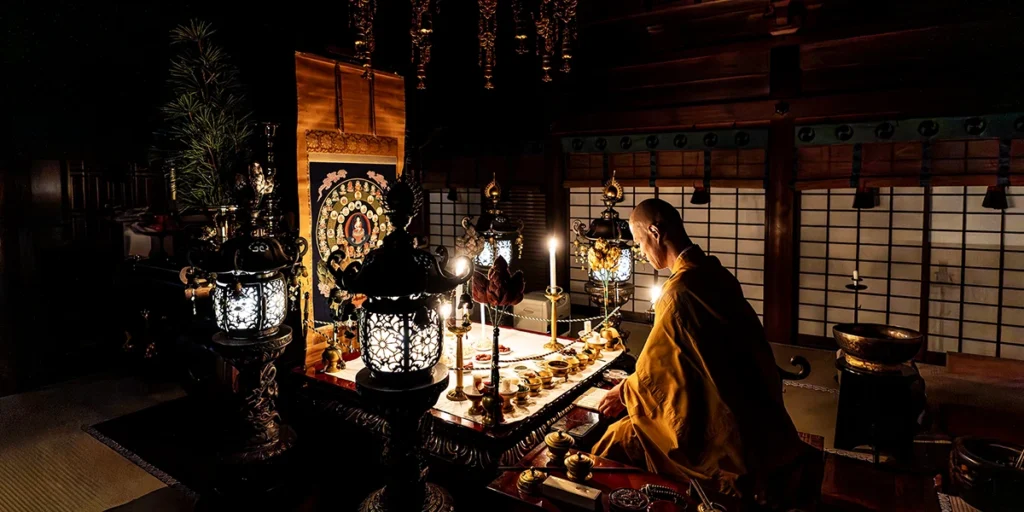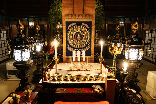 法要での所作は完全非公開のため、詳細はお伝えできませんが、燈籠とロウソクだけの空間で、役僧が一人きりで秘儀を行う神秘的な空間はこの儀式ならでは。星曼荼羅にお供えものをして印を組み、観想の世界で祈りが捧げられます。