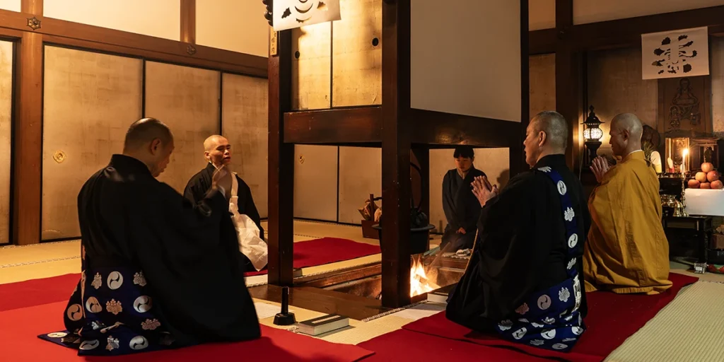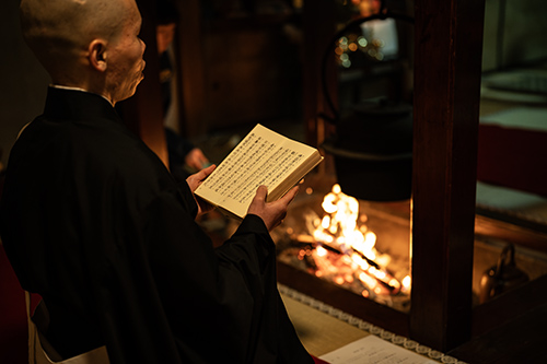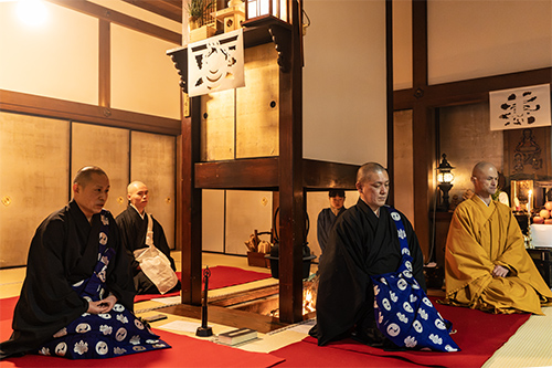 2月3日は総本山金剛峯寺をはじめ、各塔頭寺院で星供養が行われる中、清浄心院では日の入り後、午後7時からの法要が始まります。宿泊された方々は参加自由ですが、開始時間にはすでに囲炉裏の間には多くの参列者が集います。囲炉裏には火が焚かれ、煎り豆がお供えされて、僧侶たちによる読経が始まります。