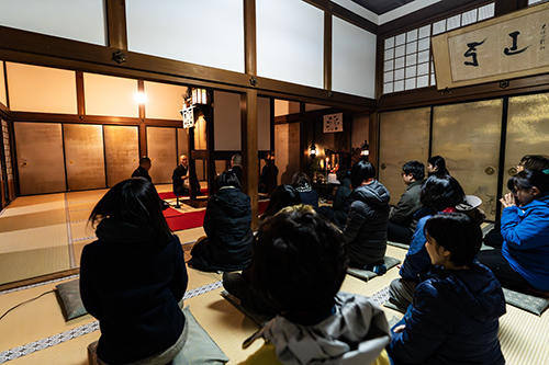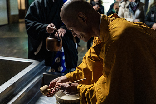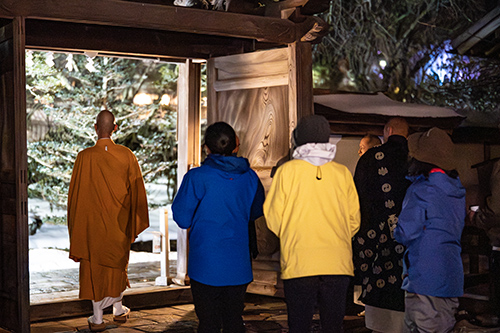 清めが終わったら、何班かに分かれ、寺院内をまわります。本堂と囲炉裏の間にお供えされた煎り豆が配られ、「福(ふく)は内(うち)!」と声を挙げながら、各部屋に豆を置いていきます。寺院内に僧侶と参列者(宿泊者)の大声が響きわたる様子はこの日だけの光景。寺院の豆まきに参加する、貴重な体験ができます。
