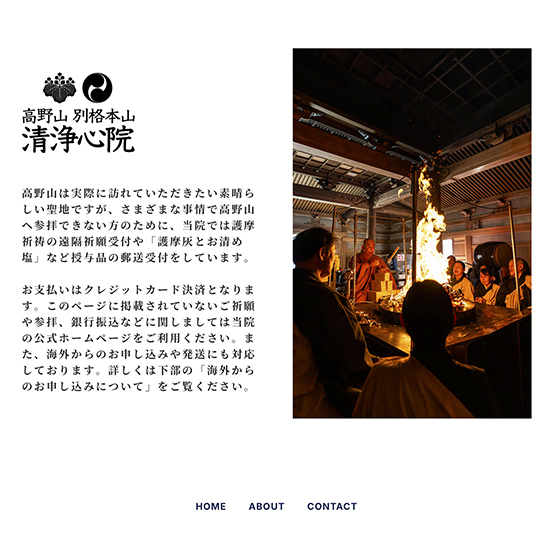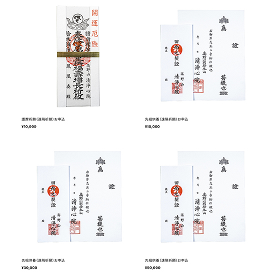 「護摩祈願」「先祖供養」「厄払い」「交通安全」のご祈願とご供養や「護摩灰とお清め塩」の授与。また毎年4月20日の廿日大師ご開帳に合わせて3日間行われる「商売繁盛・家門繁栄祈願祭」のお申し込みをクレジットカード決済でできるようになりました。また、海外からのお申し込みや発送にも対応しております。ただし、銀行振込や、その他のご祈願とご供養は従来通り、ホームページの受付フォームにてお申し込みください。