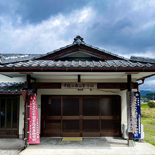 湯之前中学校付近の田園風景の中にぽつんと立つ恵山寺(えざんじ)。建物の外観は、地域の公民館のような風情で、扉を開けると、座敷のすぐ奥にお不動様がどんと構える。高さ2.5m・見下ろされ、思わず後ずさりしてしまうほど威厳に満ちている。