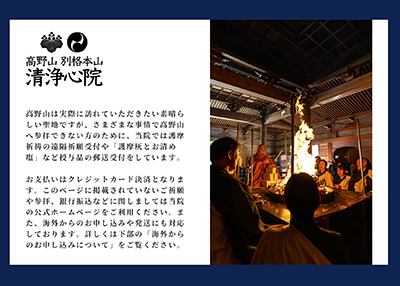 清浄心院では3月19日から3日間、春彼岸供養の護摩行を執り行います。今回は諸事情により、池口恵観住職に代わり、池口雄紹先生が住職直伝の護摩行をされることになりました。清浄心院鳳凰奏殿にて仏様ご先祖様や、亡き大切なご家族様のお塔婆を立てて、護摩供養いたします。 -
